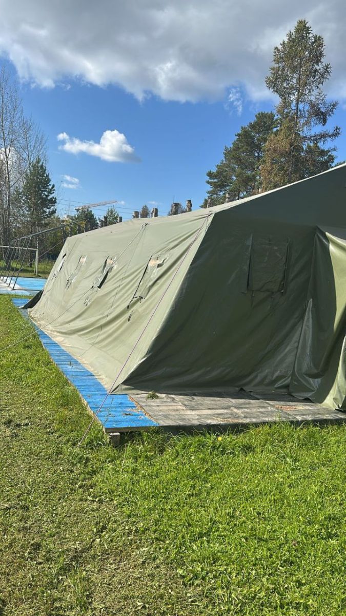 Палатка М-36 Армейская палатка на 36 человек, всесезонная Стоит на вооружении в РФ в настоящее время. Палатка имеет особо прочный жесткий каркас из стальных профильных звеньев, который выдерживает снеговую нагрузку до 140 кг/м². Ветроустойчивость достигает 48 кг/м². Палатка состоит из комбинированного внешнего тента с полностью влагонепроницаемой крышей из двухслойной ПВХ-ткани. Стенки внешнего тента выполнены из натуральной парусины для обеспечения естественной вентиляции. В крыше имеются два забранных стальными листами дымоходных люка, в стенках – рукава для подключения тепловых пушек и проводки. Внутренний тент моющийся. Окна снабжены противомоскитными сетками и съемным заполнением из оргстекла. Входы имеют тамбуры. Отопленная палатка с установленными стенками отепления выдерживает мороз до -50⁰C. Вместимость палатки: 36 человек на двухъярусных кроватях.