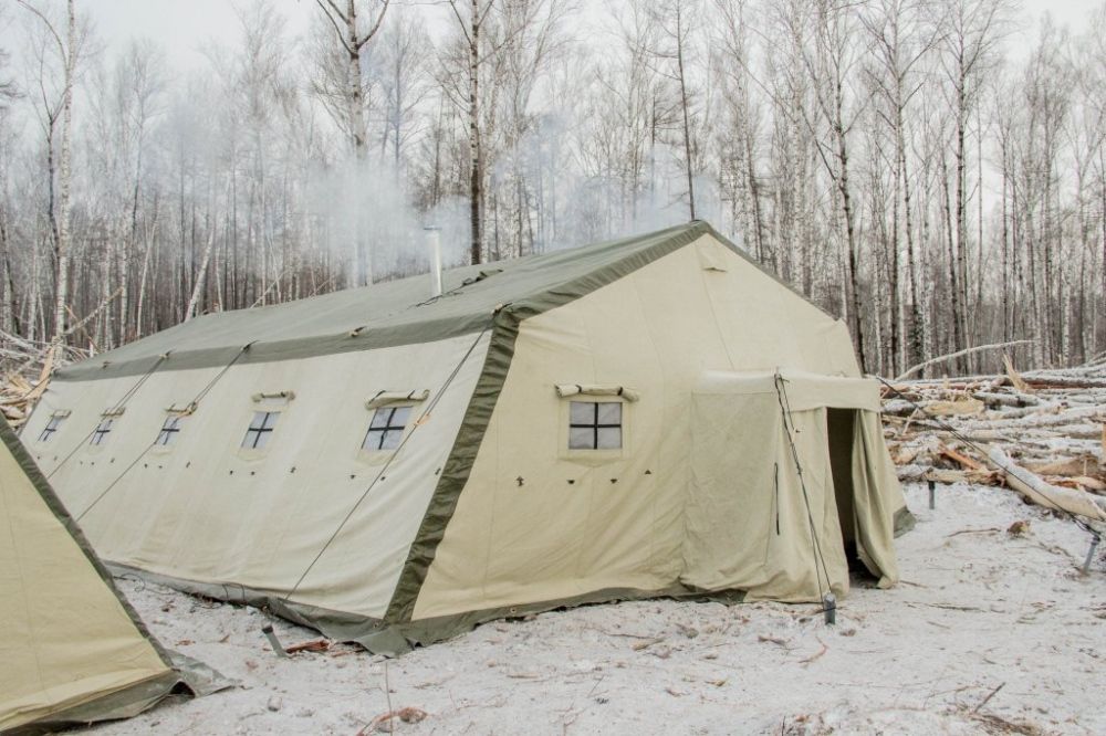 Палатка М-70, Армейская палатка на 70 человек, всесезонная Стоит на вооружении в РФ в настоящее время. Палатка имеет особо прочный жесткий каркас из стальных профильных звеньев, который выдерживает снеговую нагрузку до 140 кг/м². Ветроустойчивость достигает 48 кг/м². Палатка состоит из комбинированного внешнего тента с полностью влагонепроницаемой крышей из двухслойной ПВХ-ткани. Стенки внешнего тента выполнены из натуральной парусины для обеспечения естественной вентиляции. В крыше имеются два забранных стальными листами дымоходных люка, в стенках – рукава для подключения тепловых пушек и проводки. Внутренний тент моющийся. Окна снабжены противомоскитными сетками и съемным заполнением из оргстекла. Входы имеют тамбуры. Отопленная палатка с установленными стенками отепления выдерживает мороз до -50⁰C. Вместимость палатки: 70 человек на двухъярусных кроватях.